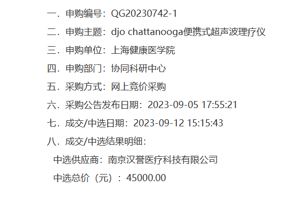 南京漢譽(yù)醫(yī)療近期就以DJO便攜式超聲波理療儀中標(biāo)了上海健康醫(yī)學(xué)院的便攜式超聲波理療儀招標(biāo)采購項(xiàng)目。