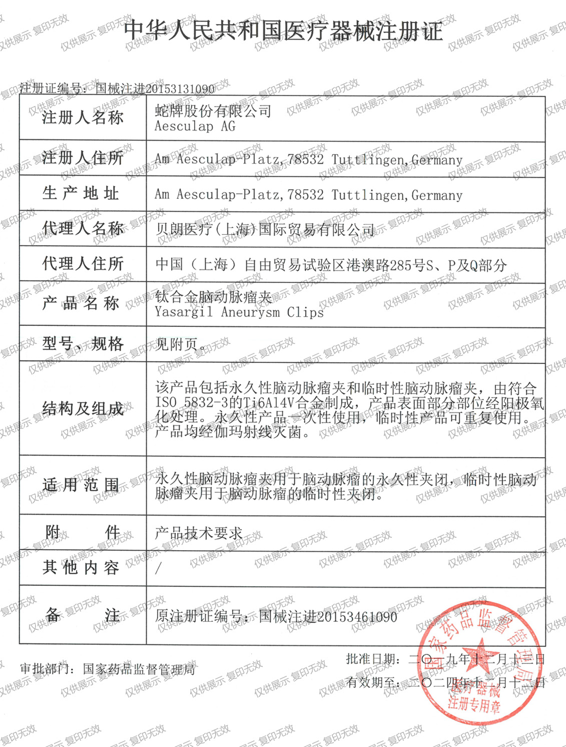 1.蛇牌鈦合金腦動脈瘤夾可能含有禁忌內(nèi)容或者注意事項,具體詳見說明書;