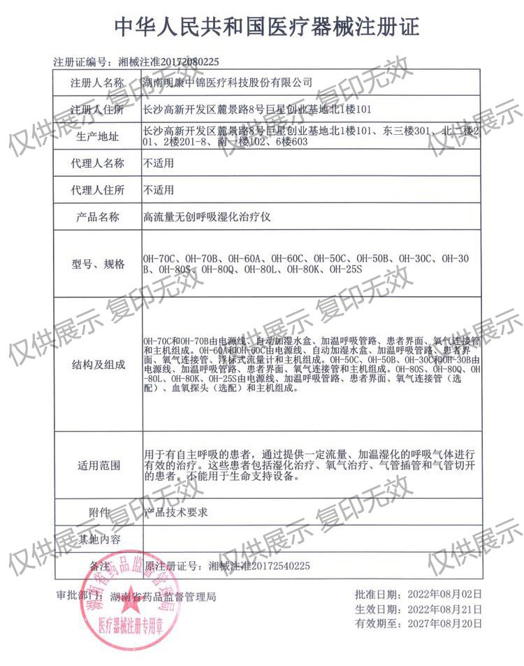 結(jié)構(gòu)及組成:OH-70C和OH-70B由電源線、自動加濕水盒、加溫呼吸管路、患者界面、氧氣連接管和主機組成。OH-60A和OH-60C由電源線、自動加濕水盒、加溫呼吸管路、患者界面、氧氣連接管、浮標式流量計和主機組成。OH-50C、OH-50B、OH-30C和OH-30B由電源線、加溫呼吸管路、患者界面、氧氣連接管和主機組成。OH-80S、OH-80Q、OH-80L、OH-80K、OH-25S由電源線、加溫呼吸管路、患者界面、氧氣連接管(選配)、血氧探頭(選配)和主機組成。