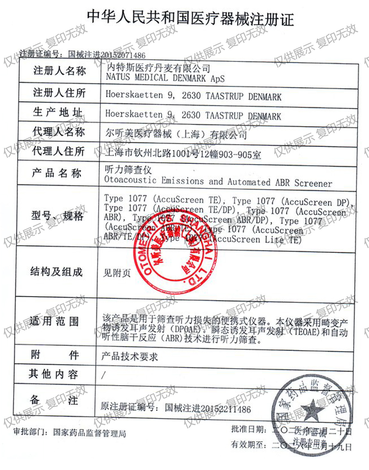 適用范圍:該產(chǎn)品是用于篩查聽力損失的便攜式儀器。本儀器采用畸變產(chǎn)物誘發(fā)耳聲發(fā)射(DPOAE)。瞬態(tài)誘發(fā)耳聲發(fā)射(TEOAE)和自動(dòng)聽性腦干反應(yīng)(ABR)技術(shù)進(jìn)行聽力篩查。